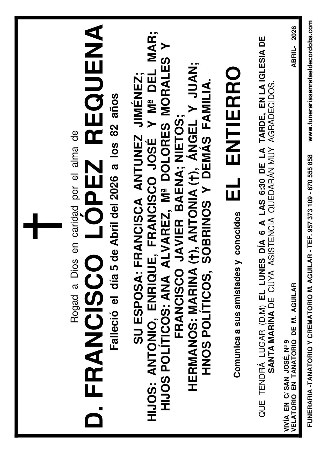En Funeraria San Rafael de Córdoba nos encargamos de todo: Impresión, reparto, anuncio en periódico. FRANCISCO LÓPEZ REQUENA DOMINGO PEREZ RUÍZ FUNERAL ANA DE TORO ARIZA FUNERAL ROSARIO ROMERO SECADA ESPERANZA MIRANDA FERNÁNDEZ FRANCISCO RUIZ MACIAS ANA DE TORO ARIZA anterior 1 2 3 … 157 próximo