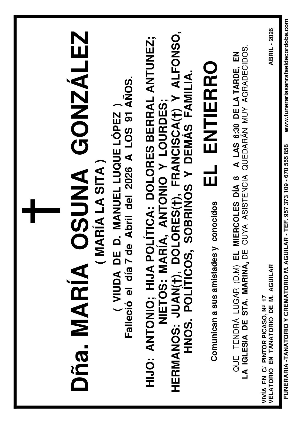 En Funeraria San Rafael de Córdoba nos encargamos de todo: Impresión, reparto, anuncio en periódico. MARÍA OSUNA GONZÁLEZ FRANCISCO LÓPEZ REQUENA DOMINGO PEREZ RUÍZ FUNERAL ANA DE TORO ARIZA FUNERAL ROSARIO ROMERO SECADA ESPERANZA MIRANDA FERNÁNDEZ FRANCISCO RUIZ MACIAS anterior 1 2 3 … 157 próximo
