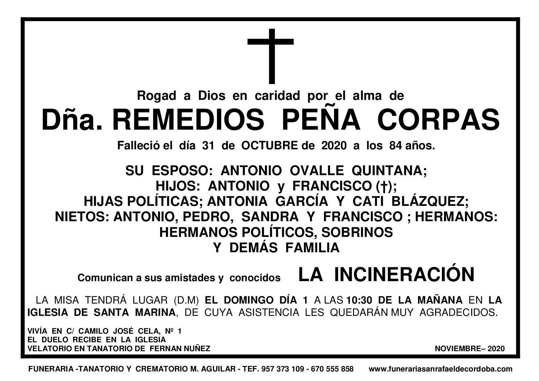 En Funeraria San Rafael de Córdoba nos encargamos de todo: Impresión, reparto, anuncio en periódico. REMEDIOS PEÑA CORPAS FRANCISCA ALVAREZ GARCÍA SALVADOR ALBA LUNA MISA 1º ANIVESARIO RAFAEL RAMIREZ CECILIA ANTONIA HIDALGO ROSAL EMILIO ALMAGRO CRESPO PACO LÓPEZ SERRANO anterior 1 … 82 83 84 85 86 … 151 próximo